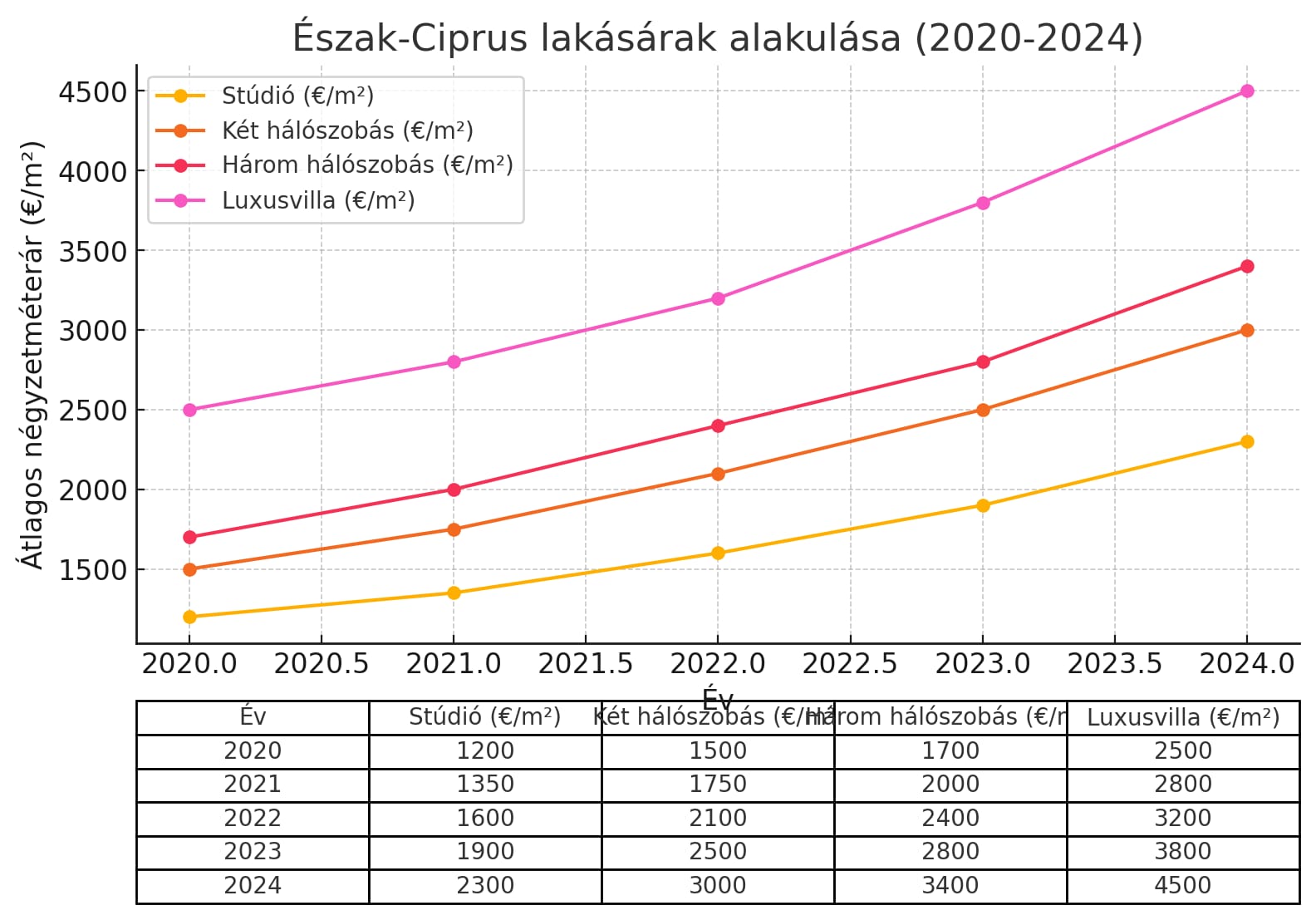 | Év | Stúdió (€ / m²) | Két hálószobás (€ / m²) | Három hálószobás (€ / m²) | Luxusvilla (€ / m²) |